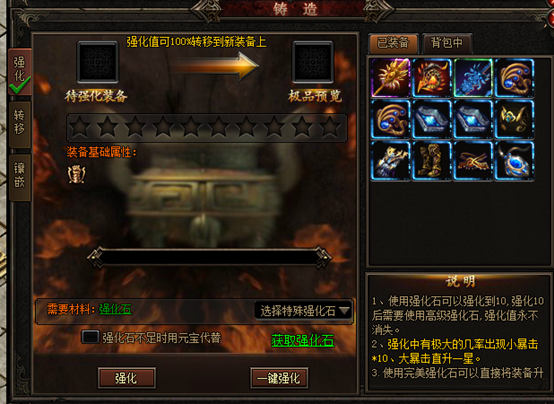 想要提升战力,我们首先得有一套说的过去的装备来强化。强化石一般是副本,每天30分钟刷一次的BOSS,还有商店,寻宝,都能获得。然后强化装备,全身强化+10是有非常漂亮的特效的哦。每天30分钟刷一次的BOSS,可以爆强化石,坐骑翅膀升阶材料等。
